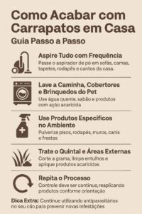5. Repita o processo: carrapatos têm um ciclo de vida longo (até 90 dias), por isso o controle deve ser contínuo. Reaplique os produtos conforme orientação e mantenha a limpeza semanal.